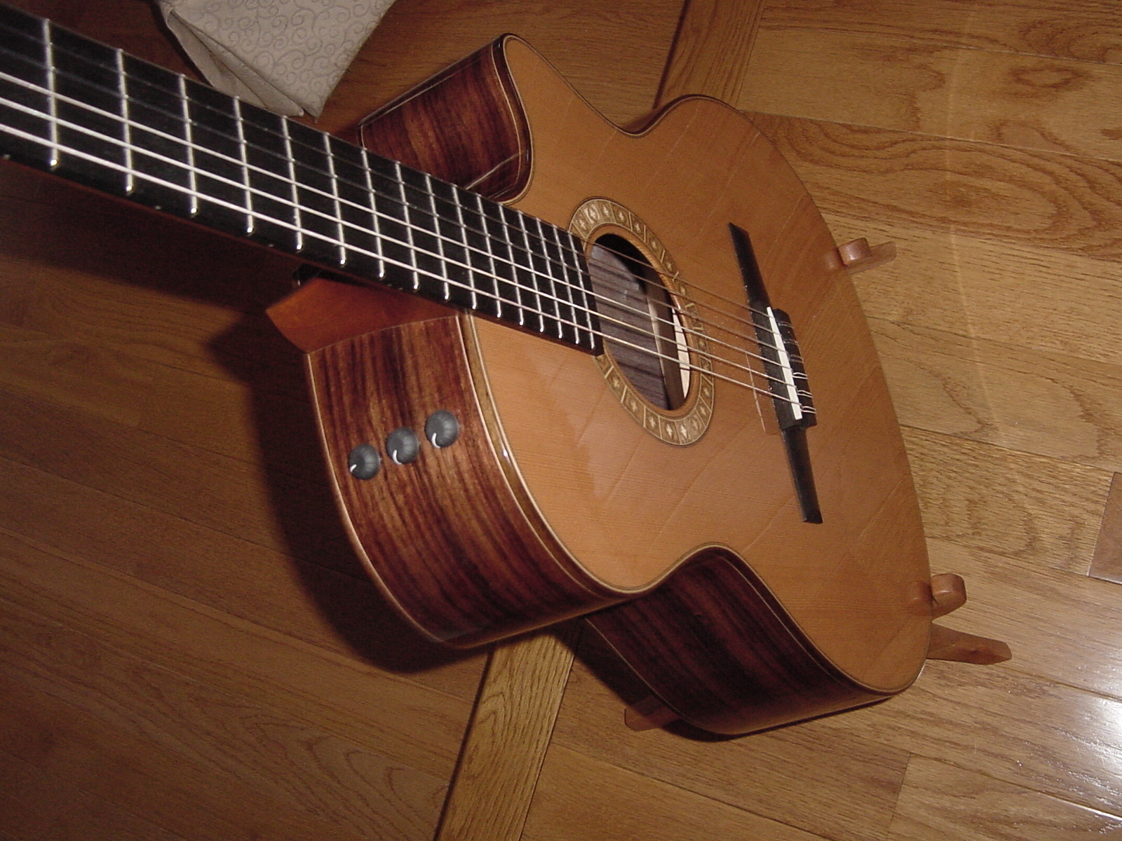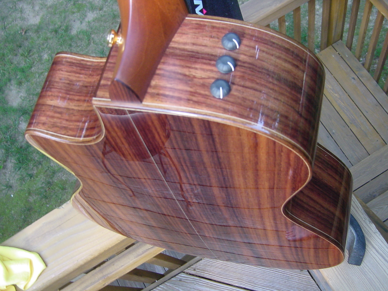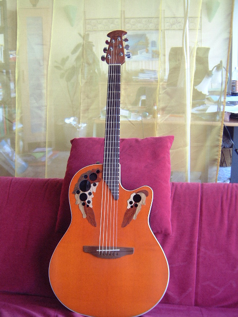 J'ai donc eu le plaisir de l'essayer pendant un bon moment et voici mes impressions. La construction est impeccable: le manche est droit et tient bien dans la main, la caisse se pose confortablement contre le ventre, c'est vraiment très agréable. La longueur du manche (16 cases hors caisse) est un peu déstabilisante mais on s'y fait rapidement. En acoustique, le son est très clair, très pur et très riche. Le spectre est bien équilibré, peut-être un peu resserré sur les médiums. C'est un vrai son Ovation, c'est-à-dire que jouer quelques arpèges et du picking évoque immédiatement la fin des années 70 et le début des années 80, ce qui n'est pas pour me déplaire.