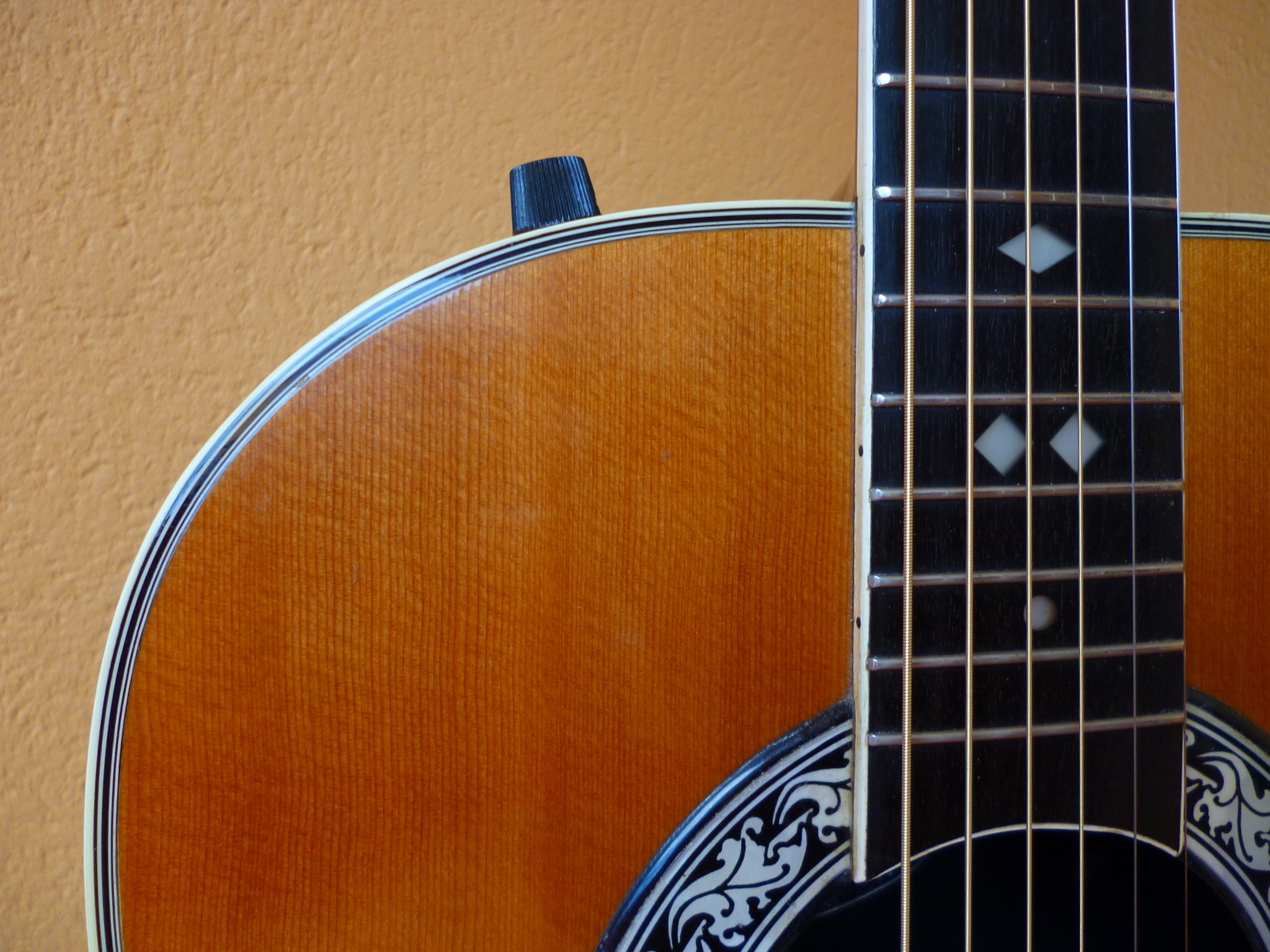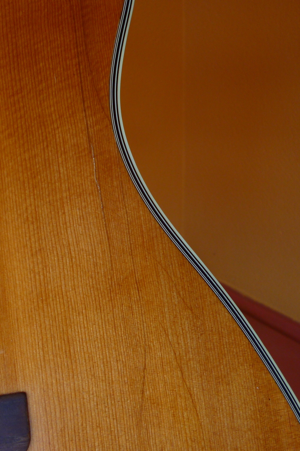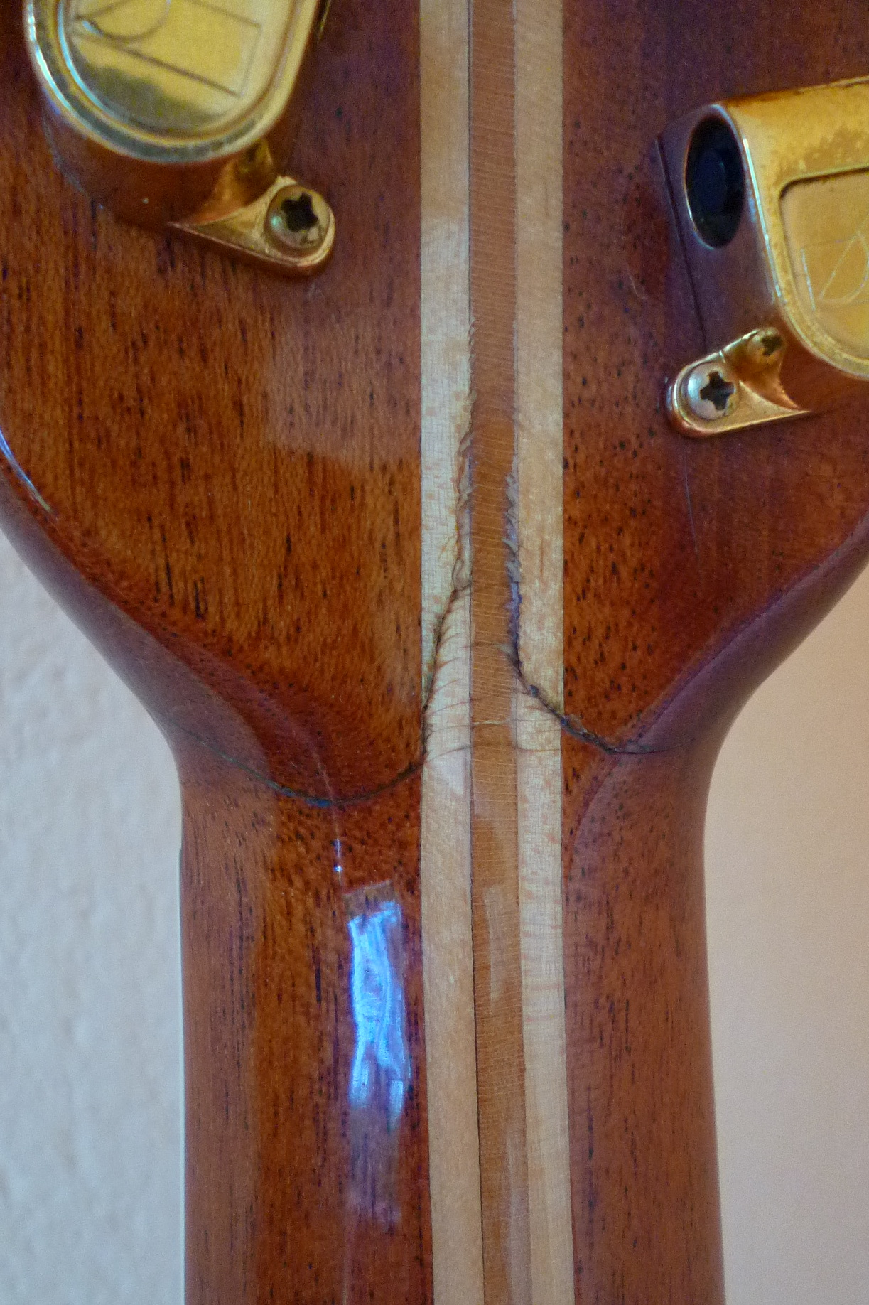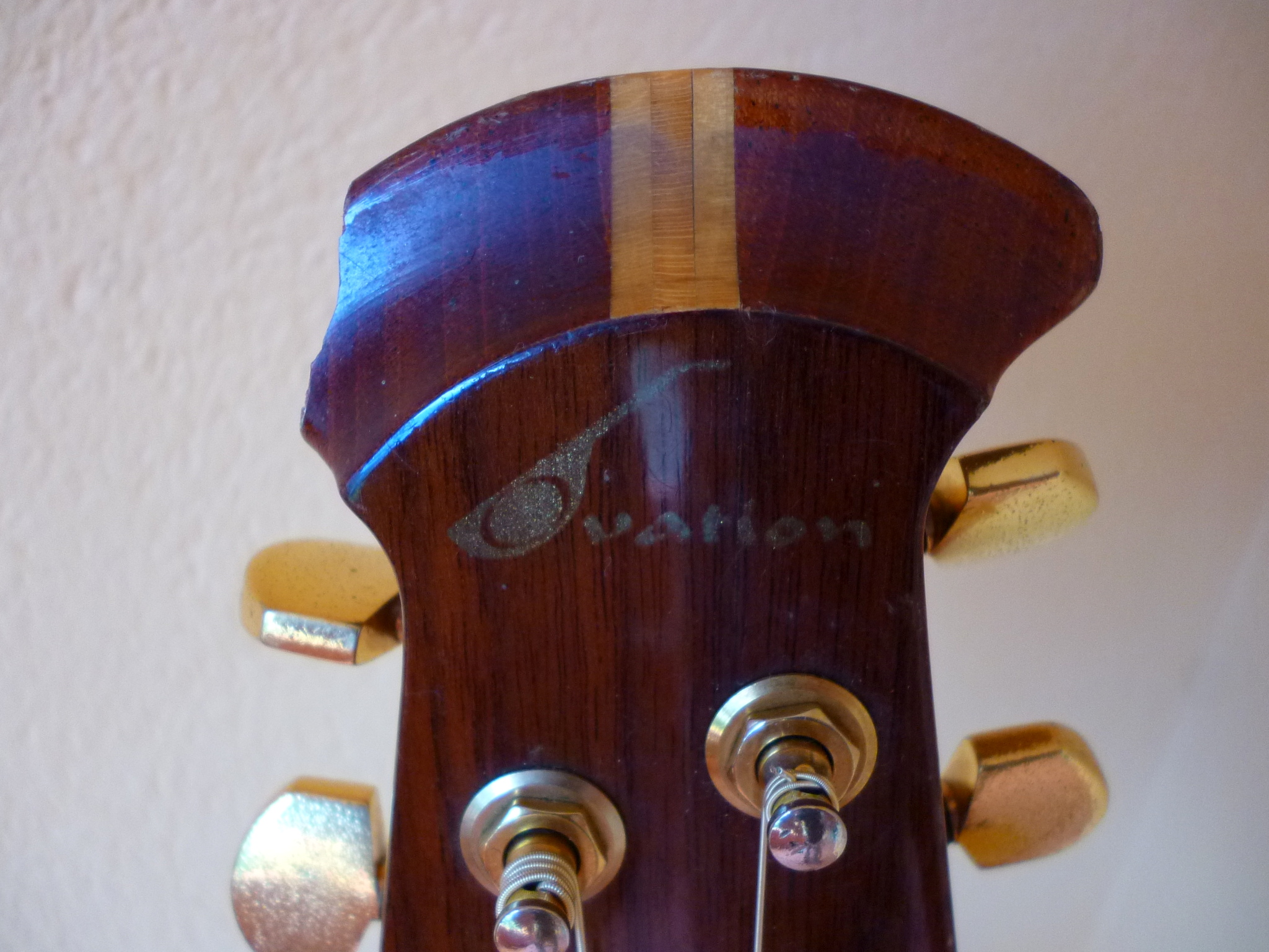 Comme vous pouvez le voir, elle à bien vécu. Une guitare qui manifestement à été beaucoup sollicitée. Des blessures témoignent de cette vie mouvementée. Notamment elle a chuté sur la tête, ce qui a entrainé la rupture de celle ci. La réparation à l'air bien faite: de face elle ne se voit pas (sauf à regarder à la loupe). Par ailleurs, un bord du haut de la tête est manquant.
