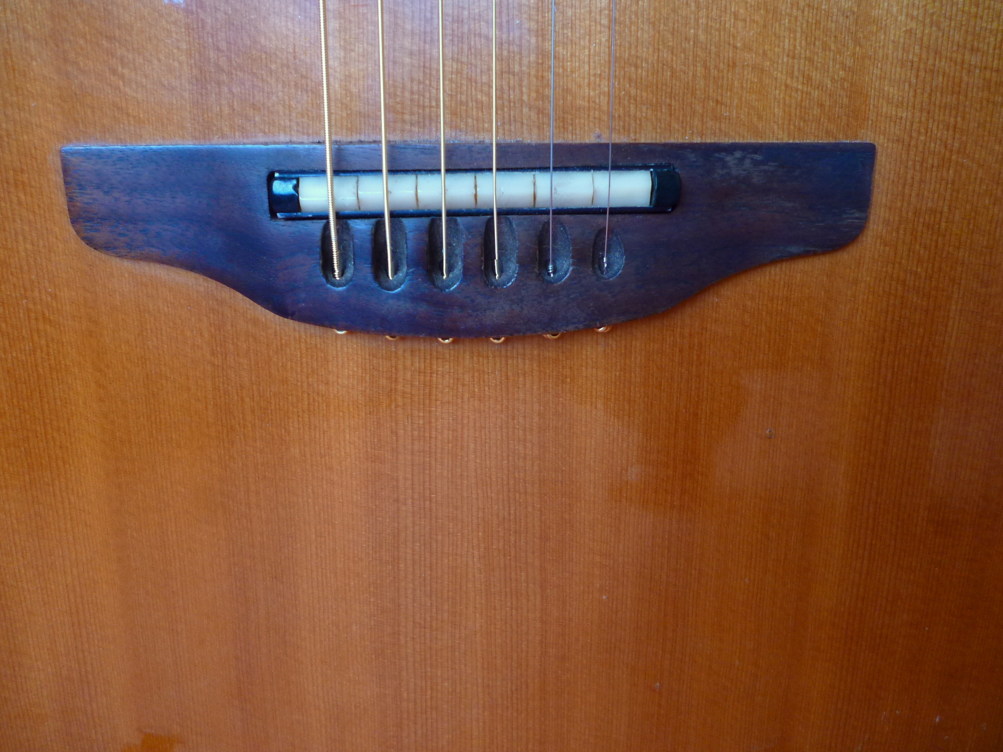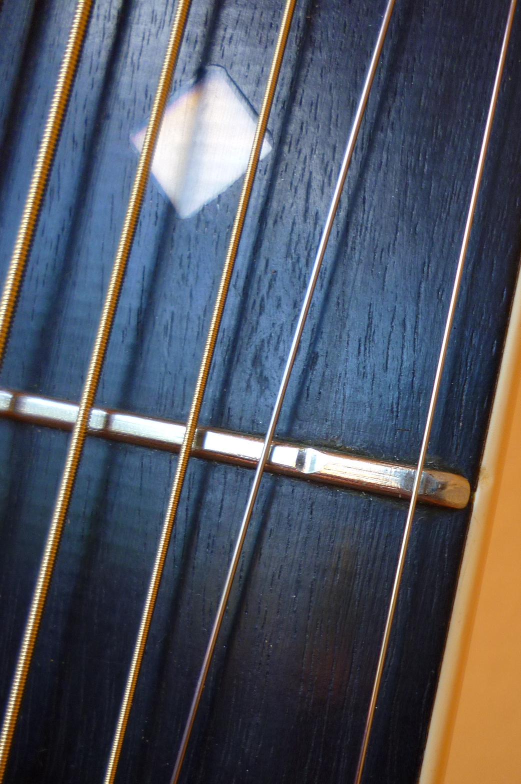 Prochaine étape: un refrettage. Certaines frettes sont pratiquement usées jusqu'à la touche. Malgré cela la guitare reste exploitable, même si le jeu sera certainement plus facile avec les nouvelles frettes.